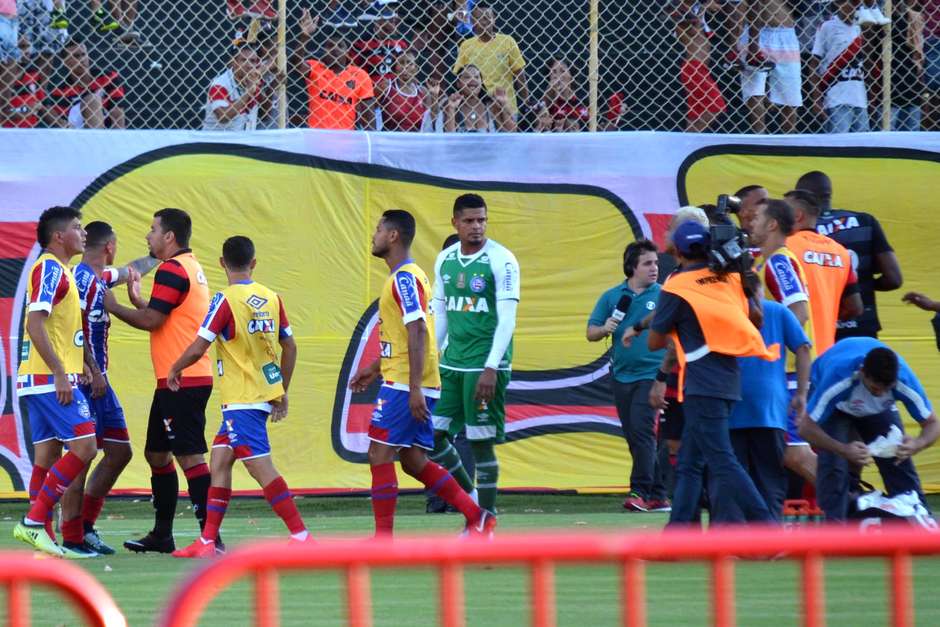 A confusão não deu trégua após as expulsões. A partida continuou violente e com as expulsões de Uillian Correia e Bruno Bispo, o Vitória acabou derrotado por W.O.