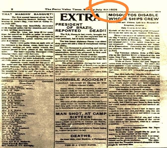 O jornal The Porto Velho Times, inteiramente redigido em inglês - língua falada pelos construtores da Estrada de Ferro Madeira-Mamoré, vem trazendo a informação sobre o primeiro banquete anual maçônico", realizado no Campo 11 da ferrovia, relacionando também o roteiro das atividades e as personalidades presentes.