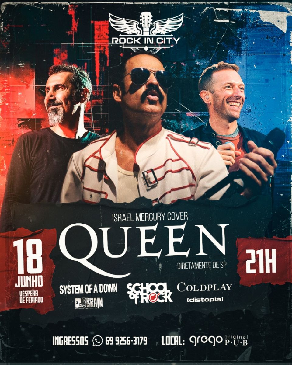 Rock in City Produções traz para Porto Velho-RO dia 18 de junho (véspera de feriado), Israel Mercury diretamente de São Paulo, com o melhor cover de Queen, interpretando os maiores sucessos do eterno Fred Mercury. Pré show com a School of Rock e pós show com a banda Distopia com o especial Coldplay e a banda Egobrain fará o especial System of a Down.