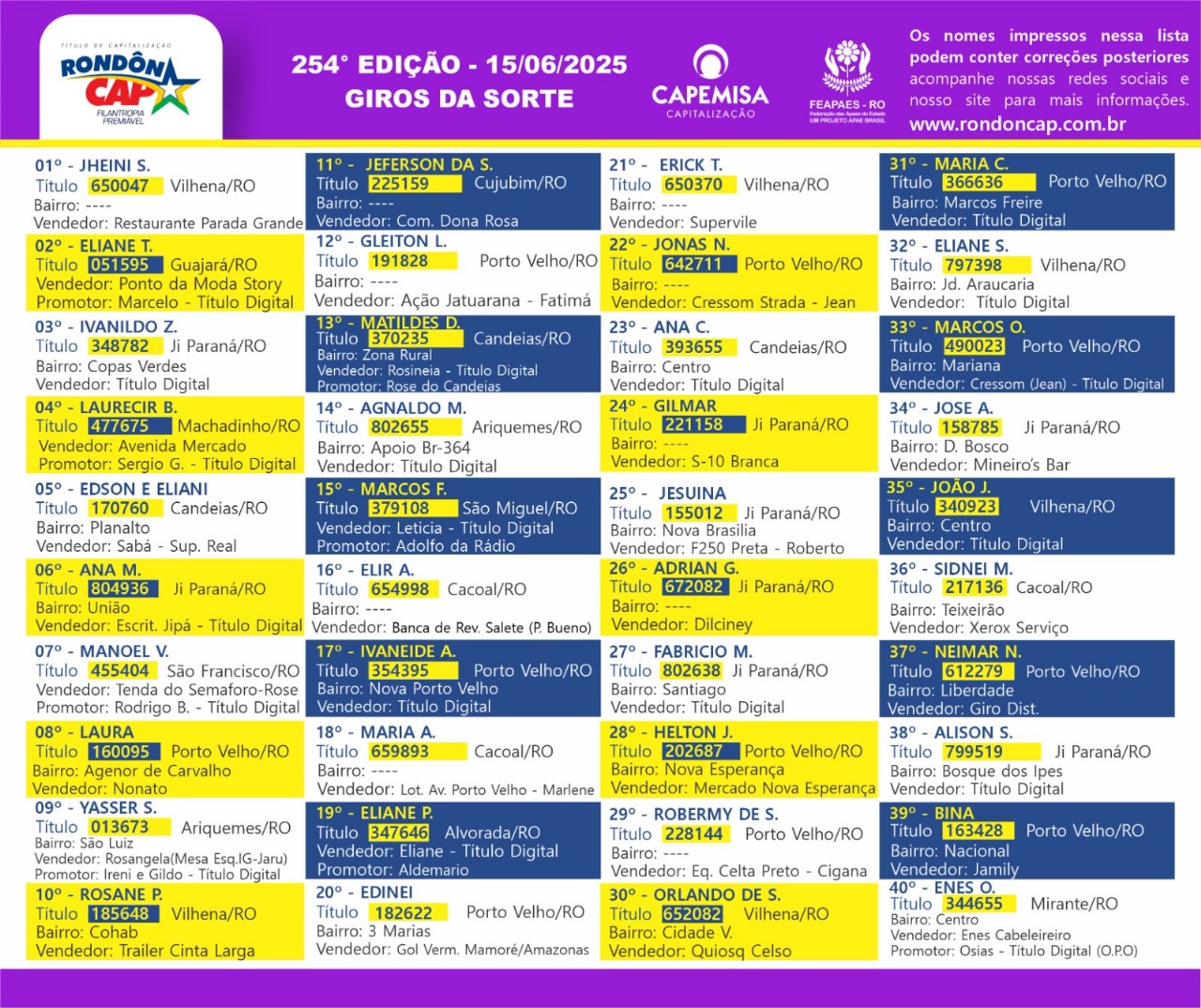 Com o RondonCAP você ajuda as APAES de Rondônia e concorre a muitos prêmios. Confira os melhores momentos do sorteio realizado no ultimo domingo, dia 15 de junho de 2025.