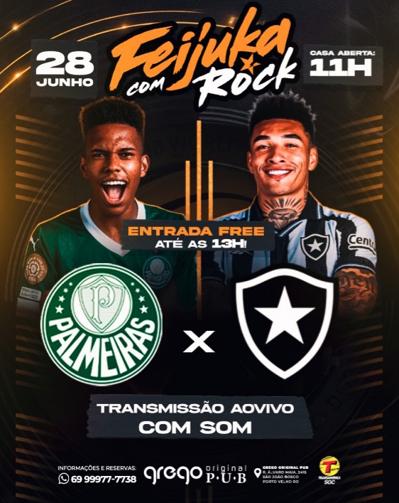 Pra quem curte a programação musical, banda Dom Rock e banda Royal Rock no palco principal. No espaço lounge, vai rolar jogo Botafogo x Palmeiras com transmissão ao vivo e narração.