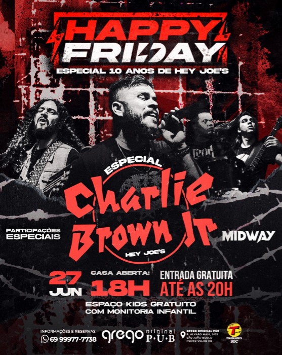 E para completar o clima, música ao vivo para embalar sua noite com o melhor do rock and roll. Essa semana teremos show especial em comemoração aos 10 anos de banda hey joes, com tributo Charlie Brown Jr. De pré show, banda Midway.