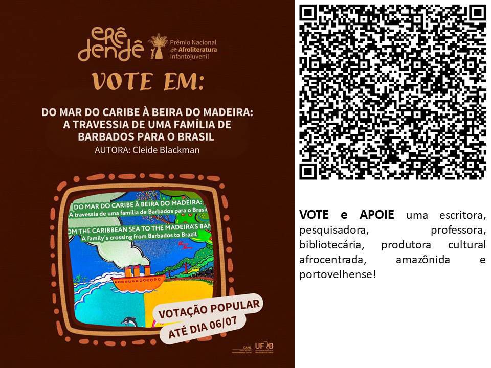 A escritora rondoniense, Cledenice Blackman está disputando o prêmio nacional de afroliteratura ‘Erê Dendê’. A mesma está concorrendo com o livro ‘Do mar do Caribe à beira do Madeira: a travessia de uma família de Barbados para o Brasil’, que conta a vinda de uma família da ilha de Barbados, no Caribe, para trabalhar na Estrada de Ferro Madeira-Mamoré. Vote aqui!