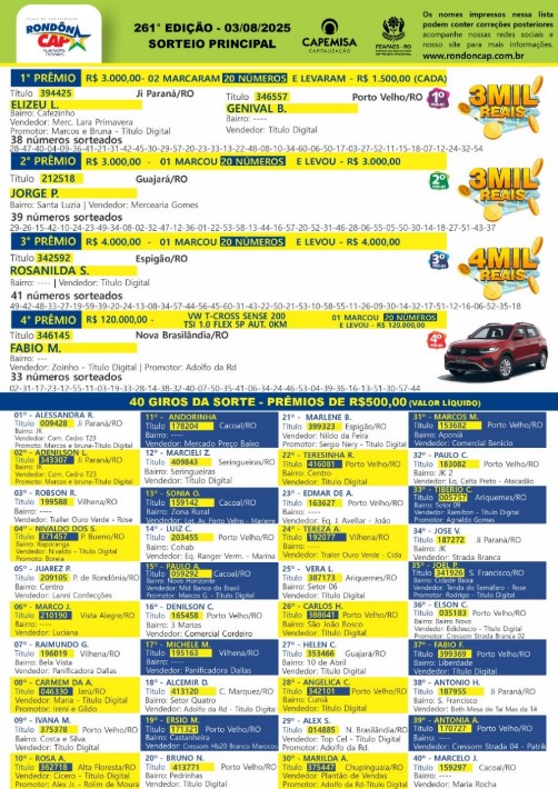 Com o RondonCAP você ajuda as APAES e concorre a muitos prêmios! São sorteios exclusivos para os Rondonienses e milhares de ganhadores. Confiraos melhores momentos do sorteio realizado no domingo, dia 03 de agosto de 2025.