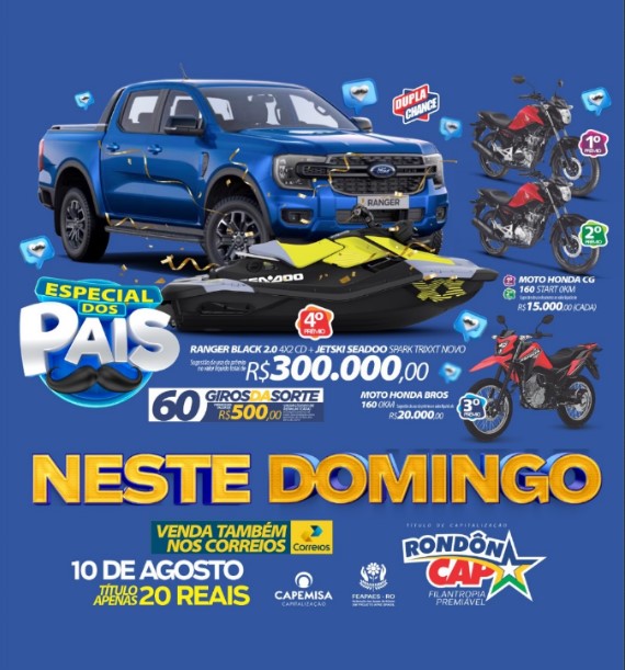 RondonCAP Especial dos Pais; é potencia na estrada, muita emoção na água e o paizão feliz da vida! No 4° prêmio tem uma Ranger com Jet ski na carroceria; e ainda tem mais 3 Motos Honda e 60 Giros da sorte! Sao 380 mil reais em prêmios o o Titulo dupla chance de ganhar. Compre seu RondonCAP fisico-QR-Code com o vendedor de sua preferencia; ajude as APAES de Rondônia e prepare o coração para a emoção do sorteio. RondonCAP, ajude as Apaes e Participe!