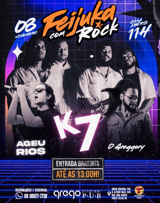 Pra quem curte a programação musical, no palco principal teremos banda O'Greggory e K7 no palco principal. Ageu rios acústico no espaço lounge.