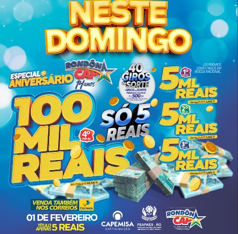 Neste domingo o RondonCAP Especial de Aniversário trás 100 mil no 4° prêmio e o Título custa só 5 reais.