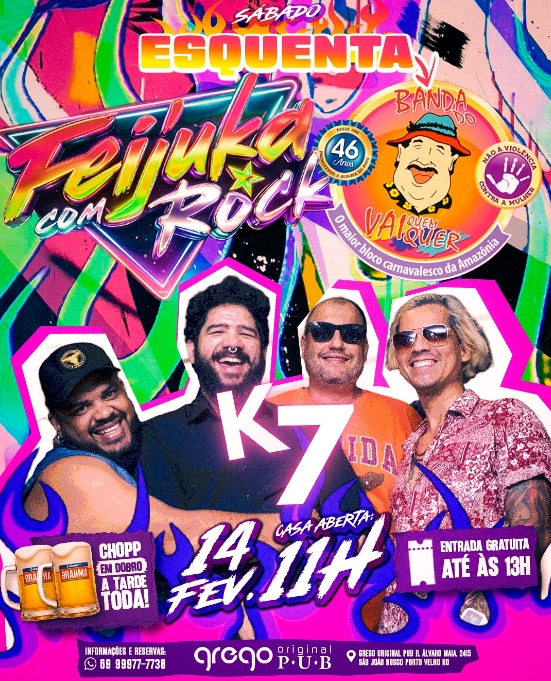 O sábado une a tradição da feijoada com a folia do Banda do Vai Quem Quer, o maior bloco carnavalesco da Amazônia. É o destino certo para quem busca o "Esquenta" oficial regado a rock e alegria.