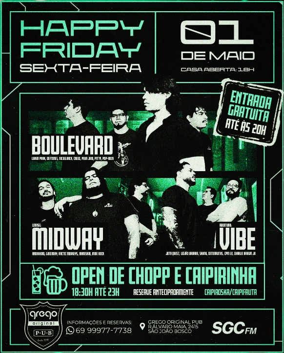 Na sexta-feira, 01 de maio, a programação ganha ainda mais força com o Happy Friday, trazendo uma mistura de rock ao vivo e open bar.