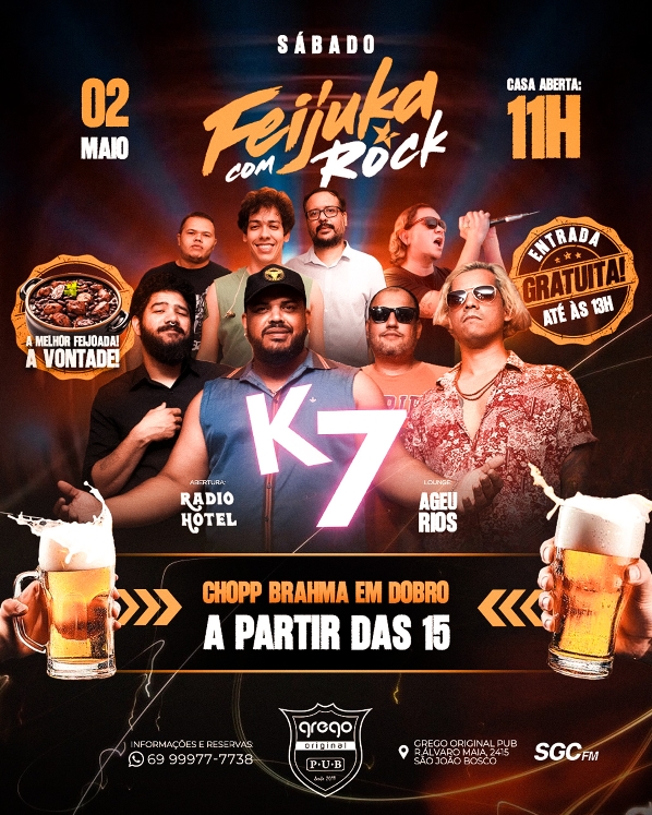 Encerrando a programação, o sábado, 02 de maio, chega com uma proposta completa para quem quer curtir o dia inteiro. O tradicional Feijuka com Rock começa a partir das 11h, com feijoada à vontade. A entrada gratuita até às 13h.