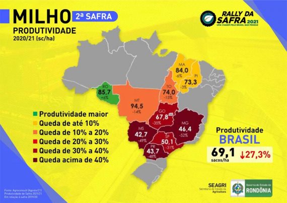 O Governo de Rondônia, por meio da Secretaria de Estado da Agricultura (Seagri), apresentou dados oficiais sobre o aumento de produtividade do milho na segunda safra de 2020/21. Os índices de uma empresa de consultoria especializada no agronegócio brasileiro, apontam que Rondônia foi o único que teve um crescimento de 6% entre os maiores produtores de milho.
