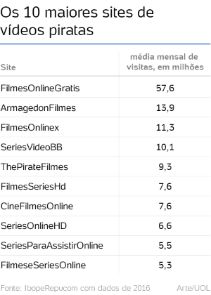 O site pirata com maior número de visitantes em 2016, o FilmesOnlineGratis.Net, tinha média de 57,6 milhões de visitas por mês – e agora está fora do ar, derrubado pela Polícia Federal. Dos 153 sites pesquisados pelo Ibope, 44 tinham média mensal de acessos superior a 1 milhão.