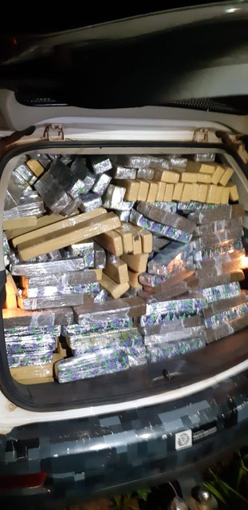 No Ônix foram encontradas 781 kg de maconha, separados em tabletes de 01 kg, um vidro de 210 ml com maconha e quatro garrafas de plástico de dois litros com sementes de maconha.