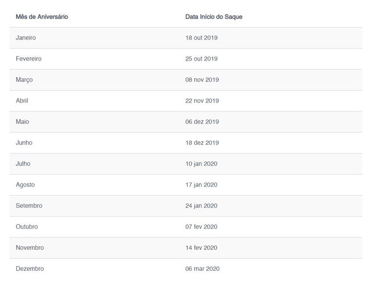 De acordo com o calendário de pagamento, os primeiros a terem direito ao benefício serão os nascidos em janeiro. Quem nasceu em fevereiro, poderá sacar a partir do dia 25 do mesmo mês. Veja a lista completa na tabela abaixo.