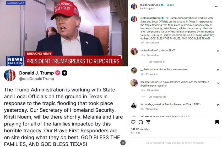 Em outra publicação, sobre as enchentes que devastaram o Texas, brasileiros celebraram o Brics, bloco de países emergentes integrado pelo Brasil, Rússia, Índia, China, África do Sul e várias outras nações.