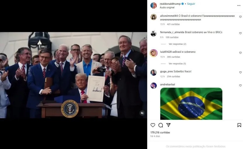 Até o momento desta publicação, os comentários do perfil de Trump no Instagram foram limitados. Não está claro se a medida está relacionada à postura dos brasileiros na rede social.