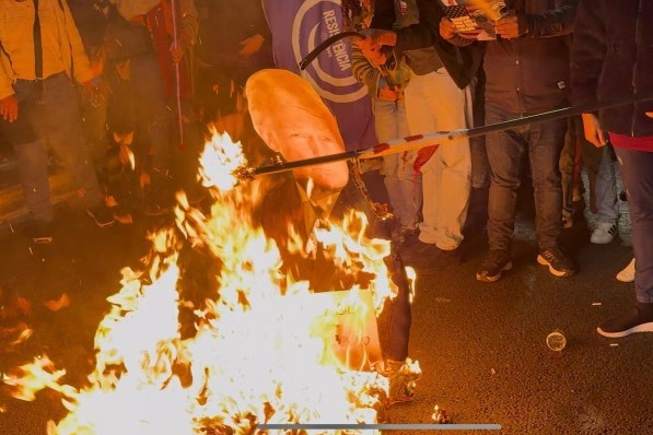 Durante o ato, manifestantes queimaram um boneco do presidente Donald Trump.