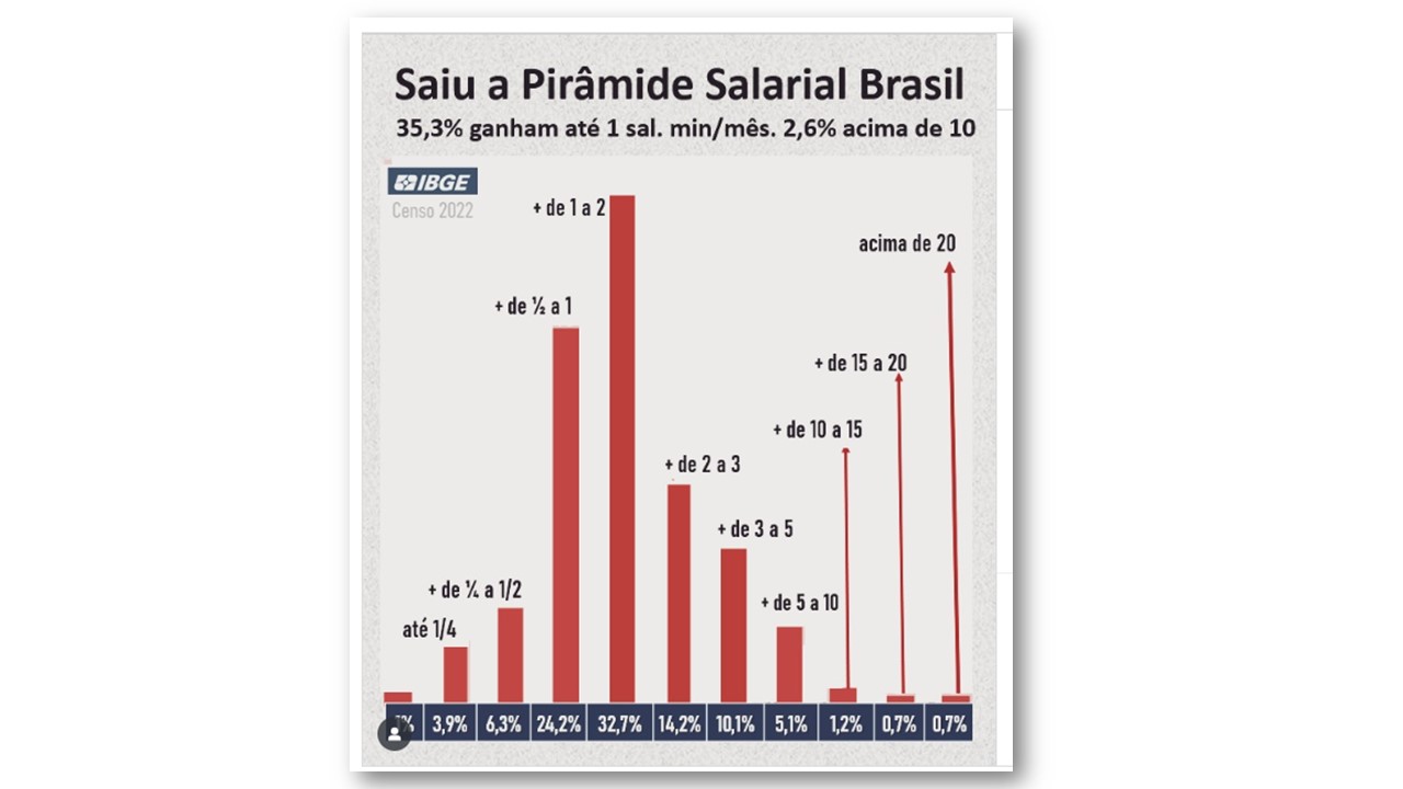 A pirâmide salarial brasileira continua marcada por fortes desigualdades. Dados do Censo 2022, divulgados pelo IBGE, mostram que 35,3% dos trabalhadores recebem até um salário mínimo por mês, enquanto apenas 2,6% ganham mais de 20 salários mínimos.