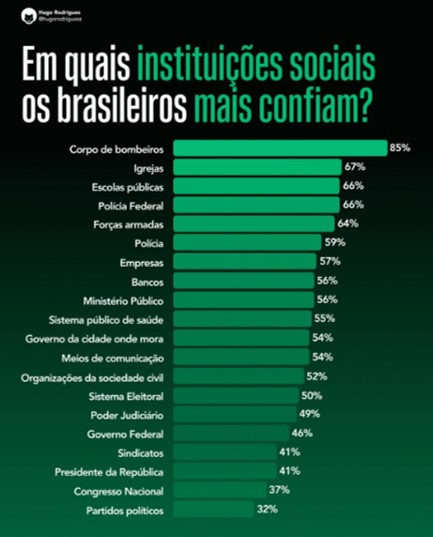 Na parte de baixo da lista, aparecem os sindicatos (41%), a Presidência da República (41%), o Congresso Nacional (37%) e os partidos políticos (32%) — mostrando a grande distância entre o povo e seus representantes.
