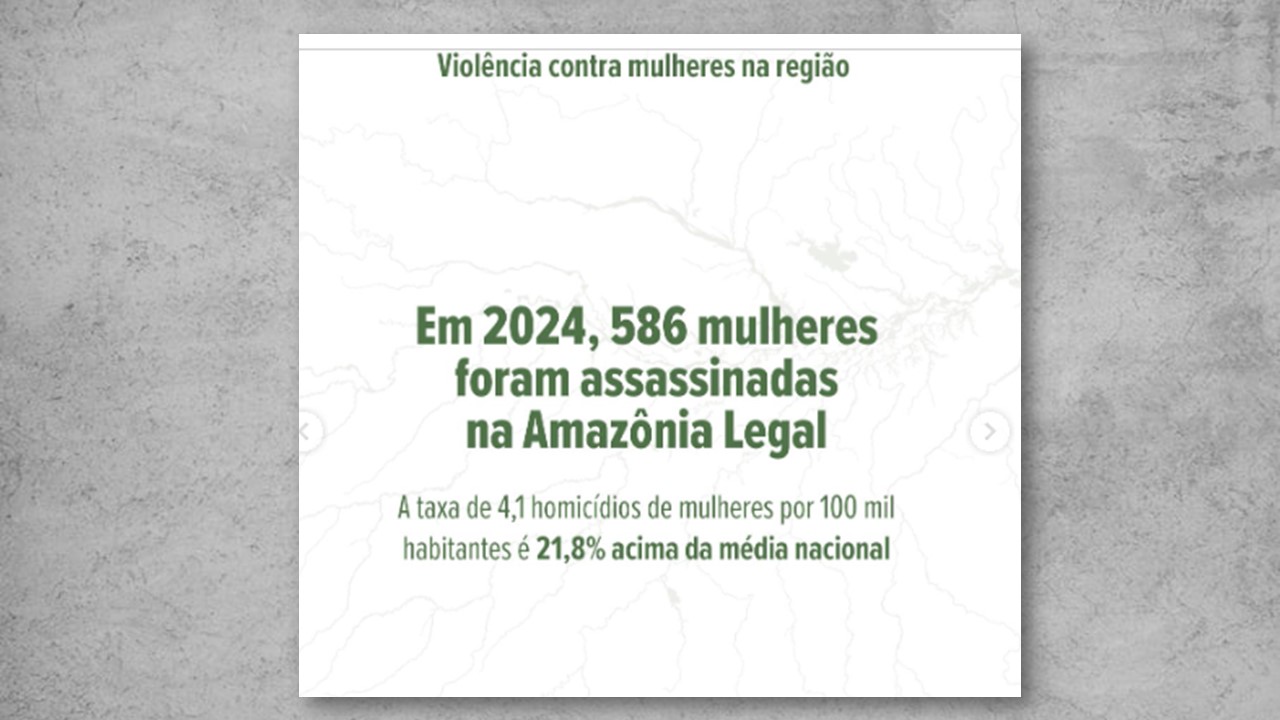 A 4ª edição do Cartografias da Violência na Amazônia revela um dado que acende um alerta urgente: 586 mulheres foram assassinadas na Amazônia Legal, colocando a região entre as mais perigosas do país para a população feminina. A taxa de 4,1 homicídios por 100 mil mulheresé 21,8% maior que a média nacional, mostrando um crescimento consistente da violência de gênero. O levantamento traz dados de 2024.