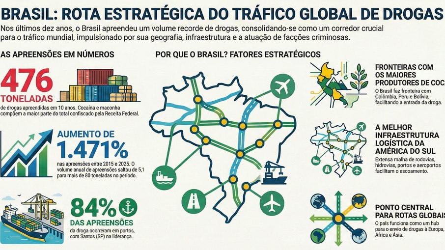 As apreensões de maconha somaram 54,5 toneladas em 2024, com forte concentração no Sul do país. Paraná (47,5 toneladas) e Santa Catarina (4,6 toneladas) responderam por 95,6% de tudo o que foi recolhido no Brasil naquele ano. Já no caso da cocaína, os maiores volumes continuam sendo interceptados em grandes corredores logísticos, com destaque para os portos de Santos, Rio de Janeiro, Salvador e Paranaguá.