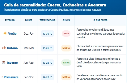 A Cuesta de Botucatu é uma formação geológica com desníveis de até 350 metros, responsável por paredões, mirantes e dezenas de cachoeiras. Cerca de 15 quedas d’água estão abertas à visitação, a maioria a menos de 20 minutos do centro.