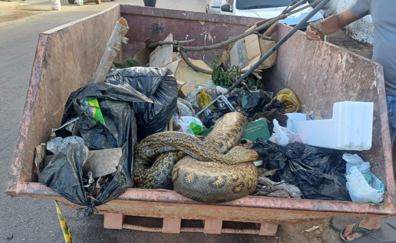 Moradores da rua Guiana, no bairro Embratel, em Porto Velho (RO), registraram imagens de uma sucuri que apareceu morta dentro de um container de papa-entulhos de uma construção. Ninguém sabe dizer como o animal foi morto e quem teria praticado o crime ambiental.