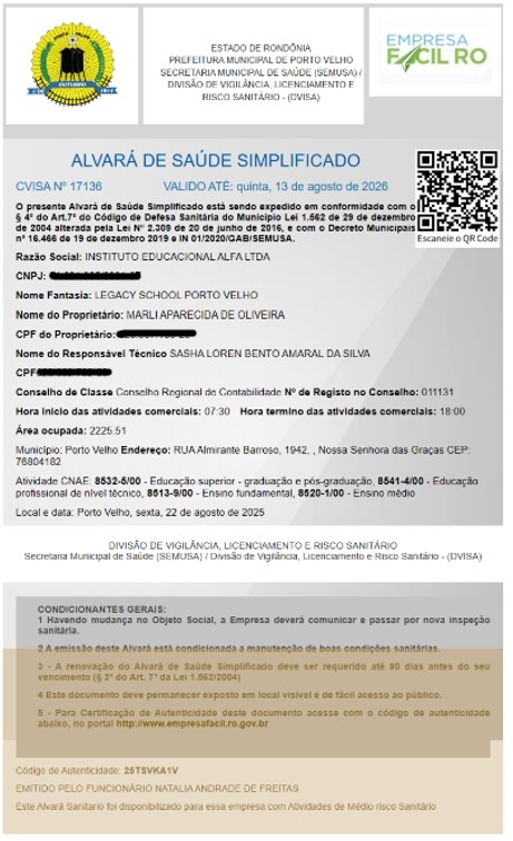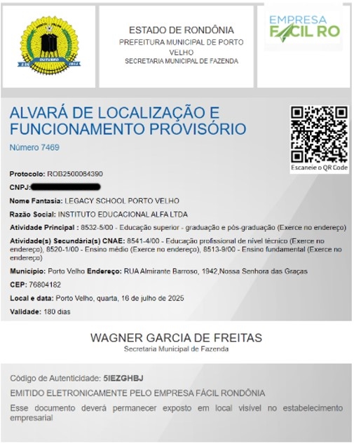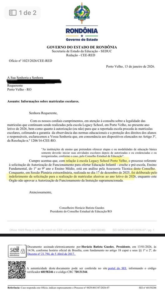 A documentação mostra um cenário ainda mais grave em relação ao colégio. O Legacy não possui autorização para funcionamento como escola em nenhum segmento educacional. Apesar disso, a instituição divulga vagas, oferta ensino e realiza matrículas, inclusive para a Educação Infantil, operando à margem da legislação e induzindo famílias ao erro.