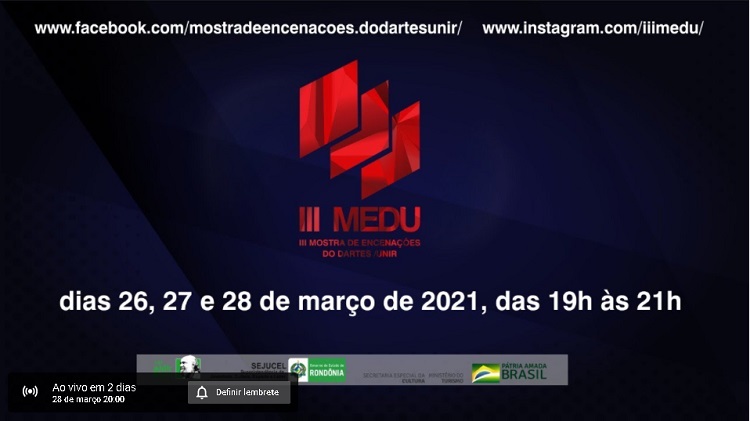 27/03 - Mostra Audiovisual das obras “Caipora” (Rafael Correia, Amanara Brandão e Vinicius Brito), “Avesso” (Ádamo Teixeira, Jamile Soares e Gabriel Corvalan), “A Carne” (Emerson Garcia e Sâmia Pandora) e “Eldorado” ( Jamile Soares, Ádamo Teixeira e Gabriel Corvalan) (Classificação indicativa: 16 anos): https://youtu.be/mAZECPVcUxA