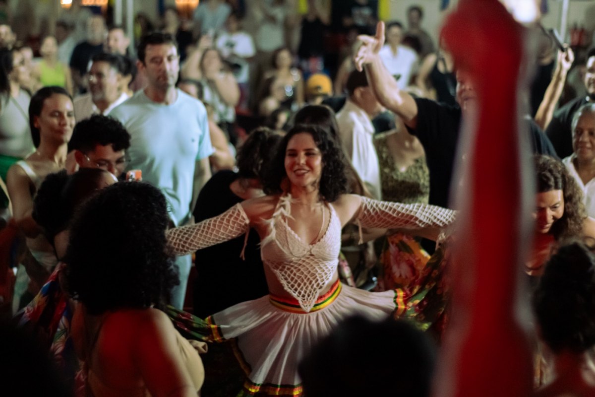 Entre os momentos de pura magia que marcaram a noite, a apresentação da atriz e dançarina Andressa Silva se destacou. Rompendo as barreiras do palco, ela espalhou sua energia pelo público, distribuindo saias e transformando o Mercado Cultural em um grande salão de dança. Em sintonia com o instante, a plateia respondeu com entusiasmo, tornando a cena ainda mais envolvente e memorável.
