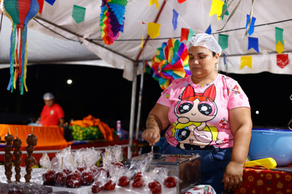 Além das apresentações folclóricas, outro atrativo do arraial é a praça de alimentação repleta de opções para todos os gostos, desde morango do amor, que estão fazendo sucesso no Brasil nos últimos dias, até a tradicional barraca do milho. Daiane Garcia apostou nos doces para agradar o público. “A gente espera o ano inteiro por esse Arraial, as vendas são muito boas e a expectativa é que supere o movimento do ano passado.” Já Alzira de Freitas conquista o público com delícias feitas de milho. “O arraial traz uma oportunidade para nós, empreendedores, mostrarmos as nossas mercadorias. É um evento histórico, traz muita gente de fora, estamos aqui para receber todos e fazer boas vendas”.
