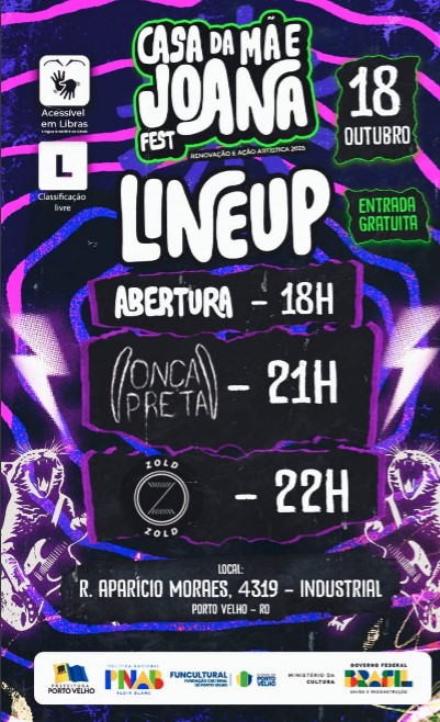 Com entrada livre e acessibilidade em Libras, o evento é aberto a todas as idades e busca promover o rock produzido na capital rondoniense. A programação será realizada na sede da Casa da Mãe Joana, localizada na Rua Aparício de Moraes, 4319, no bairro Industrial.