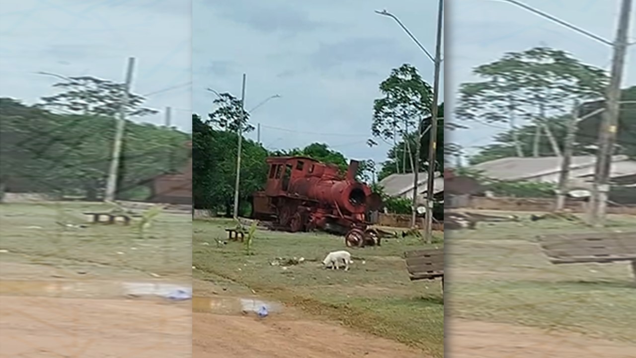 Durante recente viagem de vistoria realizada pela Associação dos Ferroviários da Estrada de Ferro Madeira-Mamoré, o presidente da entidade, George Telles, registrou o que ainda resiste do acervo histórico local. As imagens e relatos revelam um cenário de abandono, mas também de resistência simbólica: mesmo em condições precárias de conservação, uma antiga locomotiva segue exposta em uma praça às margens da BR-364. O equipamento é uma das poucas lembranças visíveis do período áureo da borracha, quando a ferrovia teve papel fundamental no escoamento da produção e na ocupação da região.