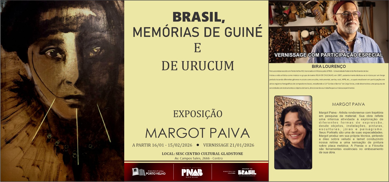 Margot Paiva, no Sesc Centro Cultural Gladstone, em Porto Velho. A mostra é aberta ao público e propõe uma imersão sensível na ancestralidade afro-brasileira e dos povos originários por meio da pintura contemporânea. O evento conta com a participação especial do músico e percussionista Bira Lourenço, cuja pesquisa sonora dialoga com matrizes afro-brasileiras e ancestrais.