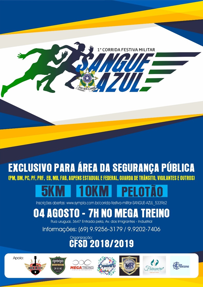 Acontece no próximo dia 04 de agosto (domingo), a primeira corrida Sangue Azul, esclusivo para a área de segurança pública (Pm, Bm, Pc, EB, MB, FAB, PF, PRF, Agepens Federal e Estadual, Guarda de trânsito, vigilantes e outros). O evento tem partida às 07h da manhã, no Mega Treino na Avenida Imigrantes, em Porto Velho (RO).