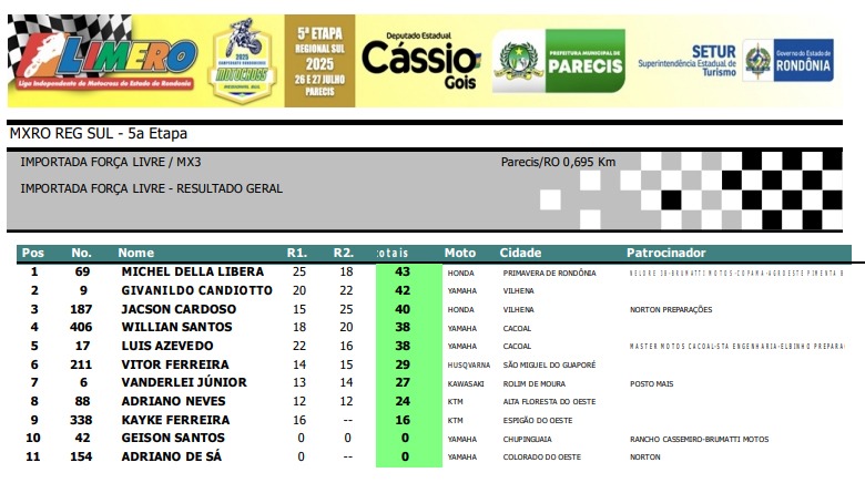Na Importada MX3, o vilhenense Givanildo Candiotto #9 levou o pódio, em segundo ficou Vitor Ferreira #211, de São Miguel do Guaporé, e na terceira colocação ficou Jacson Cardoso #187, da cidade de Vilhena.