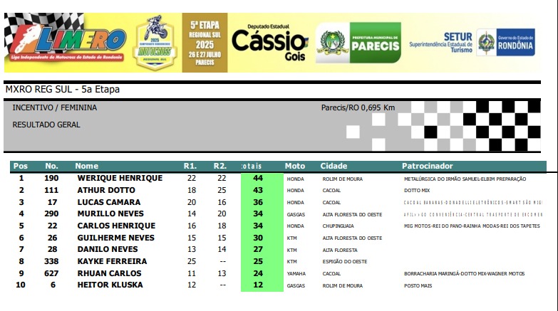 Na categoria Incentivo os primeiros colocados foram os pilotos, em primeiro Werique Henrique #190, de Rolim de Moura, em segundo ficou Arthur Dotto #111, de Cacoal e na posição de terceiro o piloto cacoalense Lucas Camara #17