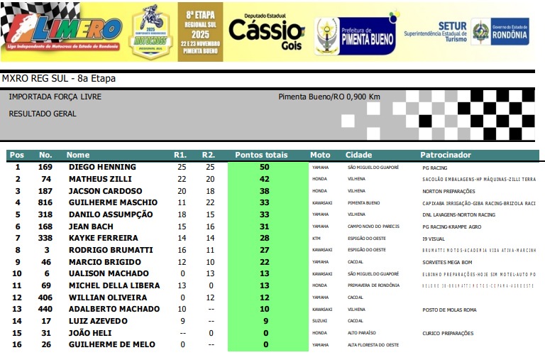 Confira abaixo os resultados por categoria da final do Regional Sul de Motocross de Pimenta Bueno.