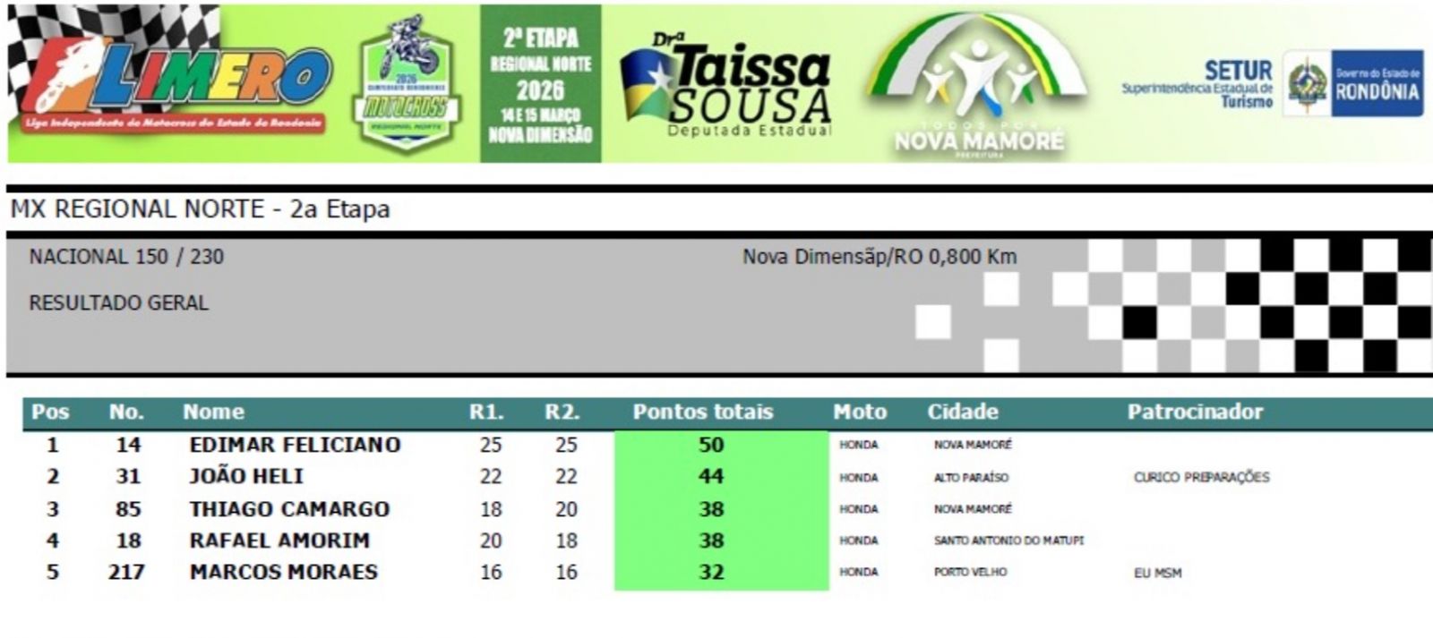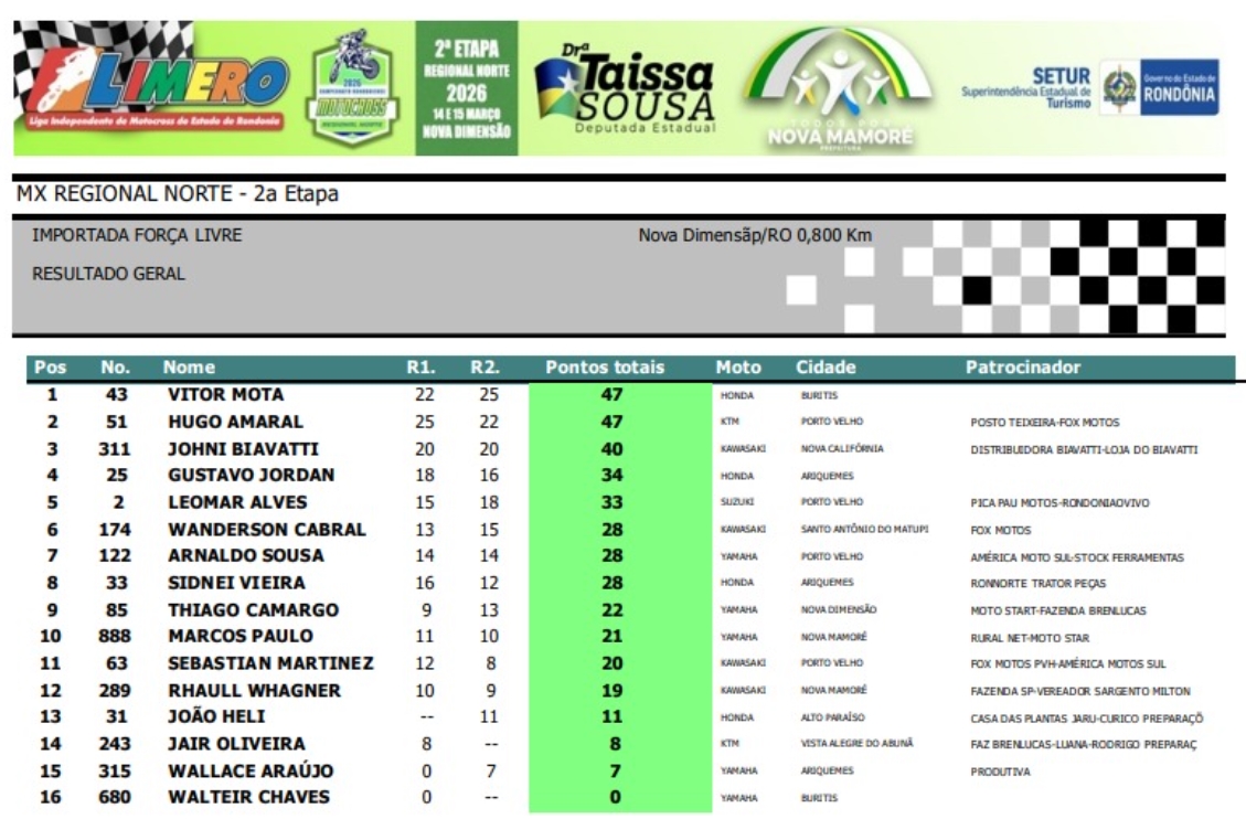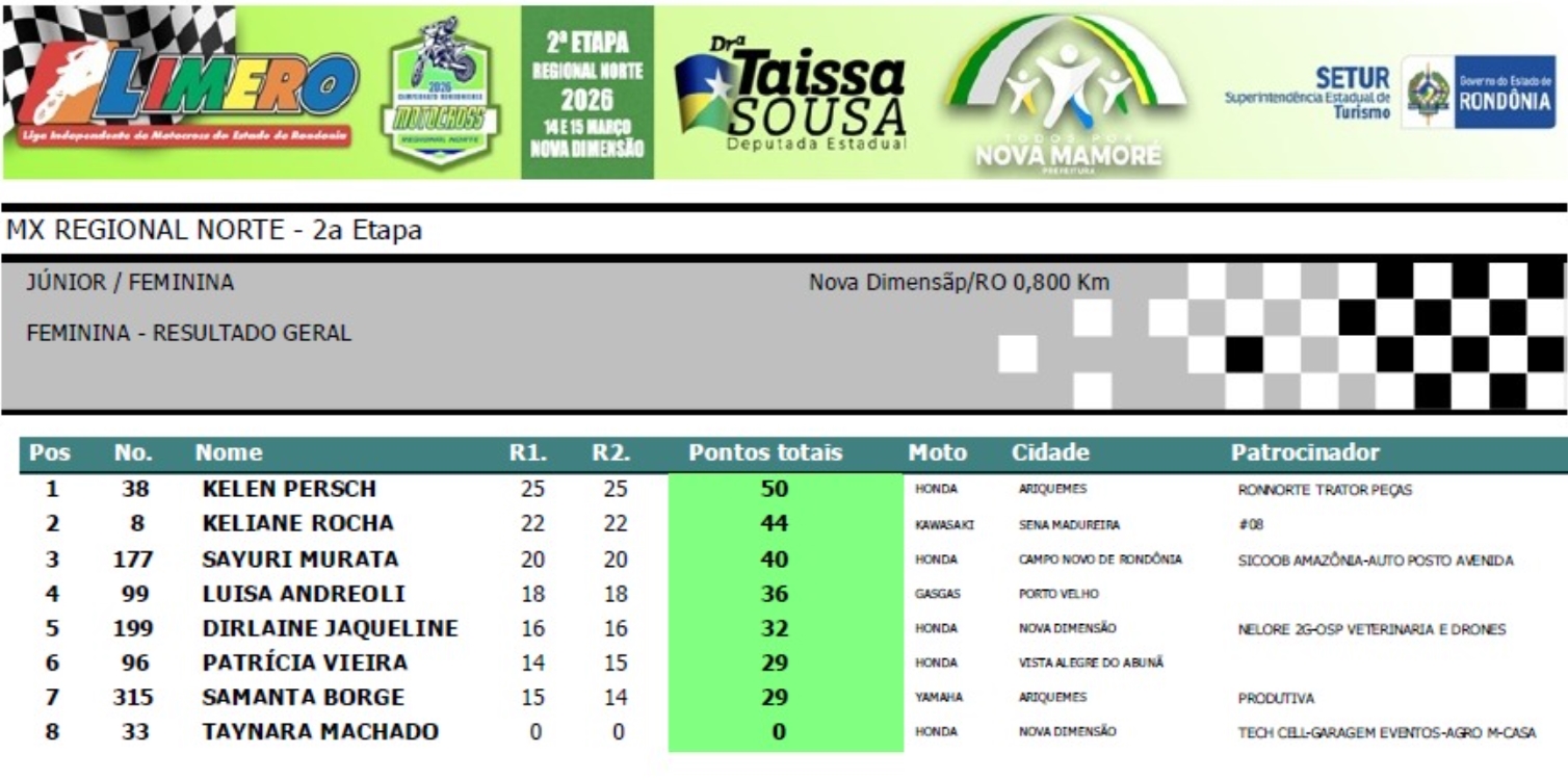 Na segunda colocação ficou o jovem Thiago Alves (#34), de União Bandeirantes. De Campo Novo de Rondônia, a atleta patrocinada pela Sicoob Amazônia e Auto Posto Avenida, Sayuri Murata (#177), ficou em terceiro. Na quarta colocação, a piloto Luisa Andreoli (#99), de Porto Velho. Em quinto ficou o corajoso Marcos Cesar (#88), de Nova Mamoré.