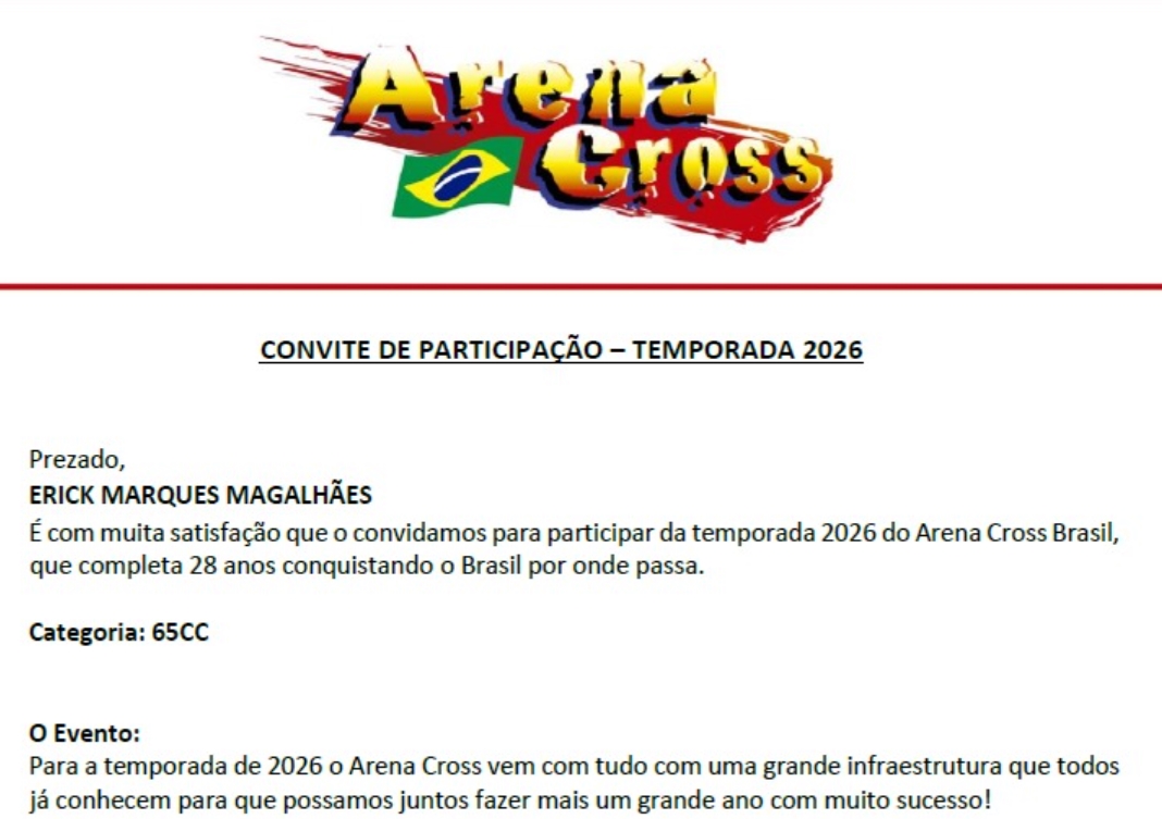 Além de brilhar nas pistas de Rondônia, Erick Magalhães já desponta como uma promessa no cenário nacional, participando de competições de prestígio como o Arena Cross e o Campeonato Brasileiro de Motocross. Para a temporada 2026, o piloto e sua equipe continuam em busca de parcerias para levar o nome de Nova Mamoré cada vez mais longe no esporte.
