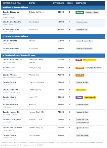 Estádios da Copa do Mundo 2026: sedes, capacidade e jogos