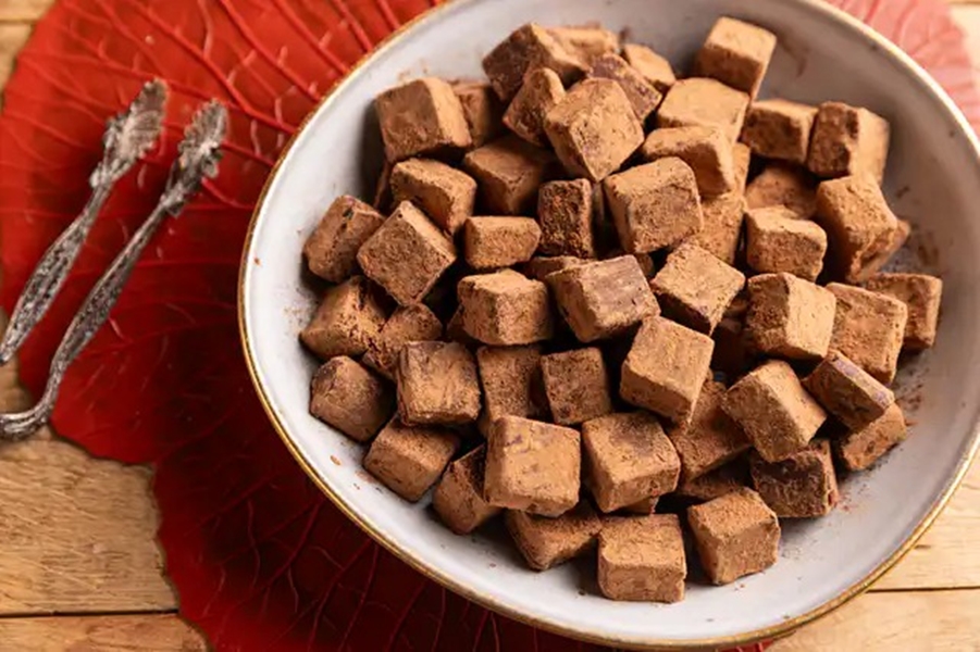 Se preferir, mantenha a placa da trufa embalada em plástico-filme na geladeira por até 15 dias, corte e passe no cacau apenas na hora de servir ou embalar para presente.