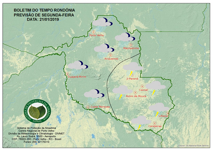 A Divisão de Meteorologia do Sistema de Proteção da Amazônia informa que a semana inicia com o tempo chuvoso em todo o centro-norte do Estado e vales do Guaporé e Mamoré. Nessa região o céu varia de nublado a encoberto. Nas demais áreas do centro-sul Rondoniense o céu permanecerá nublado durante todo o dia e a previsão é será de pancadas de chuvas seguidas de trovoadas.