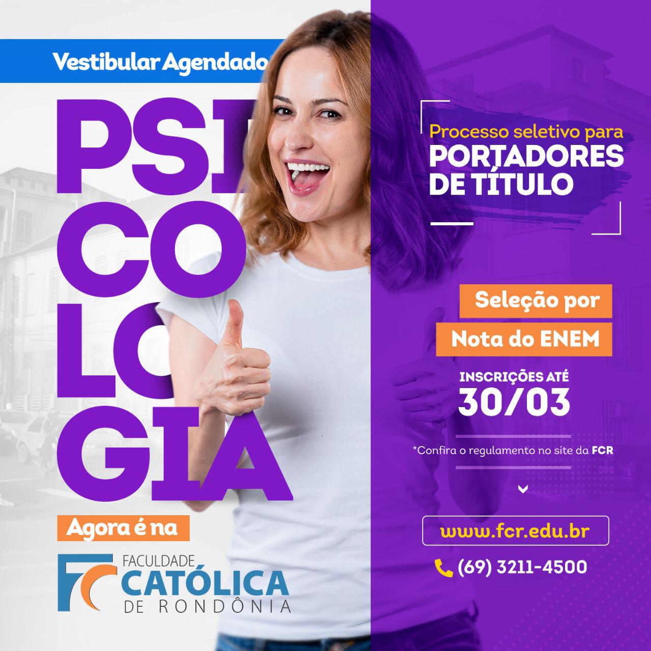Quem deseja fazer o Curso de Psicologia, da Faculdade Católica de Rondônia (FCR), em Porto Velho, tem uma dupla oportunidade nesta semana: O Vestibular Agendado, o ingresso pela nota do ENEM e também como Portador de Diploma. Para participar, basta acessar o site www.fcr.edu.br ou procurar a Secretaria da FCR, localizada na Rua Gonçalves Dias, 290, Centro, das 8h as 21h, e escolher o horário que deseja fazer a prova.
