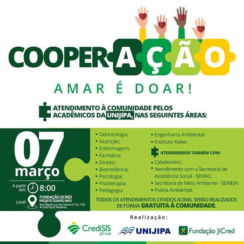 A cooperativa de crédito, CrediSIS JiCred, e a Faculdade Unijipa realizam no próximo sábado, 7, o primeiro “CooperAção - Amar é Doar". Durante o evento, os universitários oferecerão atendimentos em diversas áreas à comunidade. O CooperAção acontece durante todo o dia na Fundação JiCred.