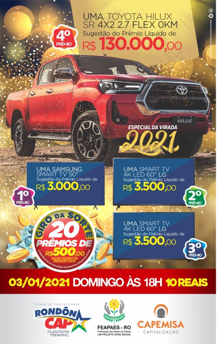 No quarto prêmio tem uma Hilux zero km no valor de 130.000 reais, é caminhonete nova na garagem ou o dinheiro na sua conta, e ainda tem 3 TVs gigantes e mais 20 giros da sorte. Rondoncap especial de ano novo, ajude as Apaes de Rondônia e deixe a sorte ajudar você, participe!
