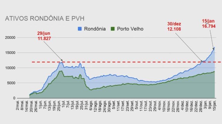 No início do segundo semestre de 2020, em 29 de junho, o Estado registrou 11.827 pessoas circulantes em Rondônia com Covid-19. Em 30 de dezembro, esse número foi superado pela marca de 12.108 casos e agora, no dia 15 de janeiro de 2021, atingimos o recorde já registrado de pessoas ativas no Estado, 16.794 (42% superior ao primeiro pico) e os números não param de crescer.