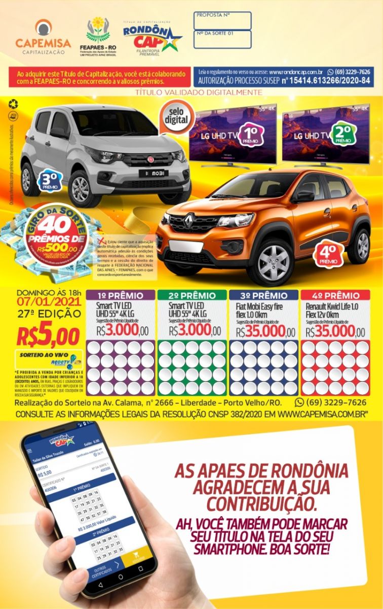 No próximo domingo, no 4° prêmio tem um Renault kwid zero km no valor de R$ 35 mil reais, no 3° prêmio tem um Fiat mobi também no valor R$ 35mil reais, no 2° e 1 ° prêmios tem uma TV gigante de 55” polegadas de R$ 3 mil reais cada, e mais 40 giros da sorte de R$ 500 reais cada um. Ajude as Apaes de Rondônia e deixe a sorte ajudar você, o título só R$ 5 reais. Participe!