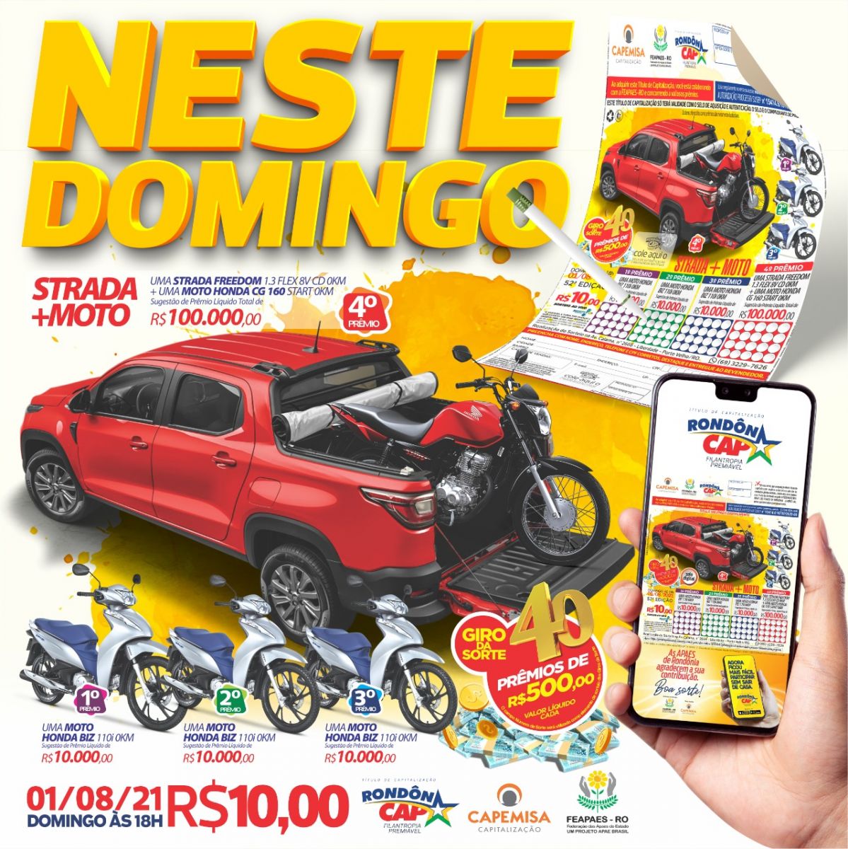 Neste domingo, o Rondoncap vai sortear uma Strada com uma moto Honda Start na carroceria no valor total de 100.000 reais. E no terceiro, segundo e primeiro prêmios tem uma Moto Honda Biz no valor de 10 mil reais cada. Além dos mais 40 giros da sorte de 500 reais.