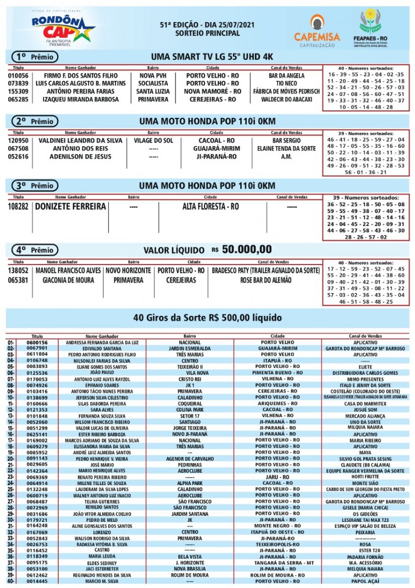 RONDONCAP: Adquira seu certificado e confira quais foram os sortudos de domingo (25)